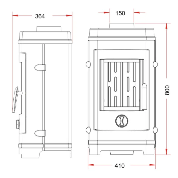 Además, la puerta del hogar está equipada con cierre automático (tipo 1) para mayor seguridad, y admite troncos de hasta 25 cm de longitud. Su salida de humos superior de Ø150 mm facilita una instalación flexible y directa.